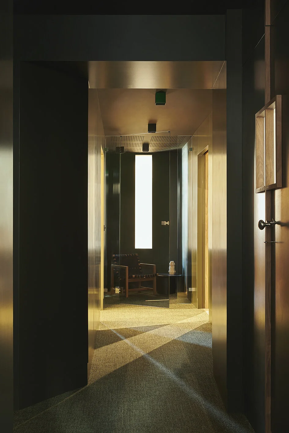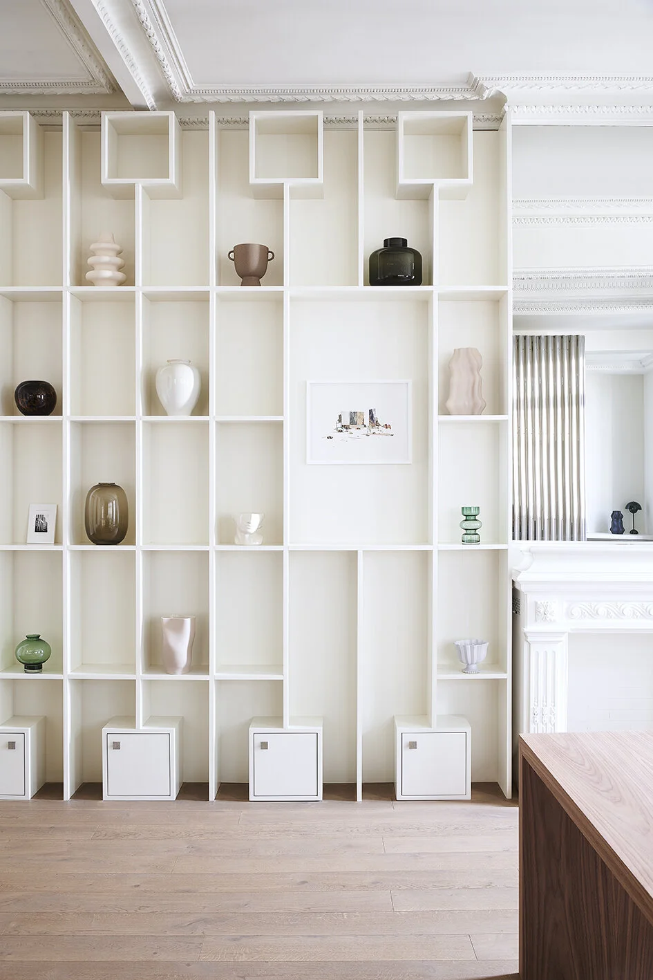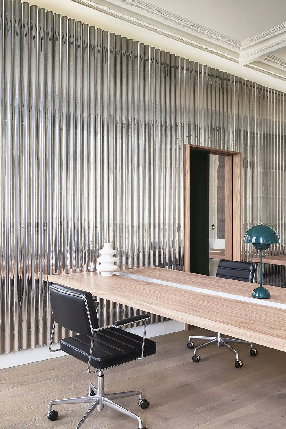 A contemporary open space. The office is designed like a container in a wealthy shipowner's building. A library like the building's railing. To house both utilitarian objects and relics from all over the world.