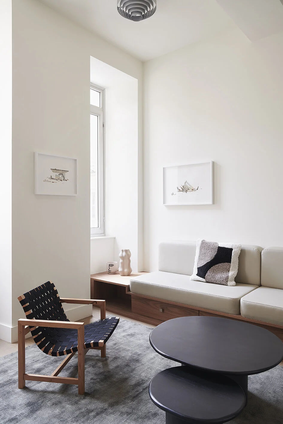 Made-to-measure couture grey sofa and velvet carpet. Oak and leather straps armchairs by Sentou. Collected drawings by Claire Trotignon.