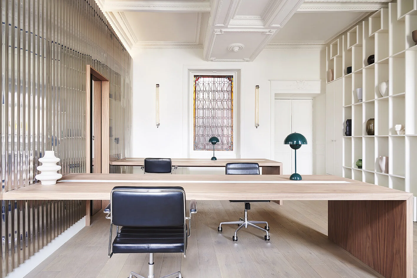 Made-to-measure walnut office desks, Studio Sammode wall lamps, Verner Panton Flowerpant desk lamps by &tradition.