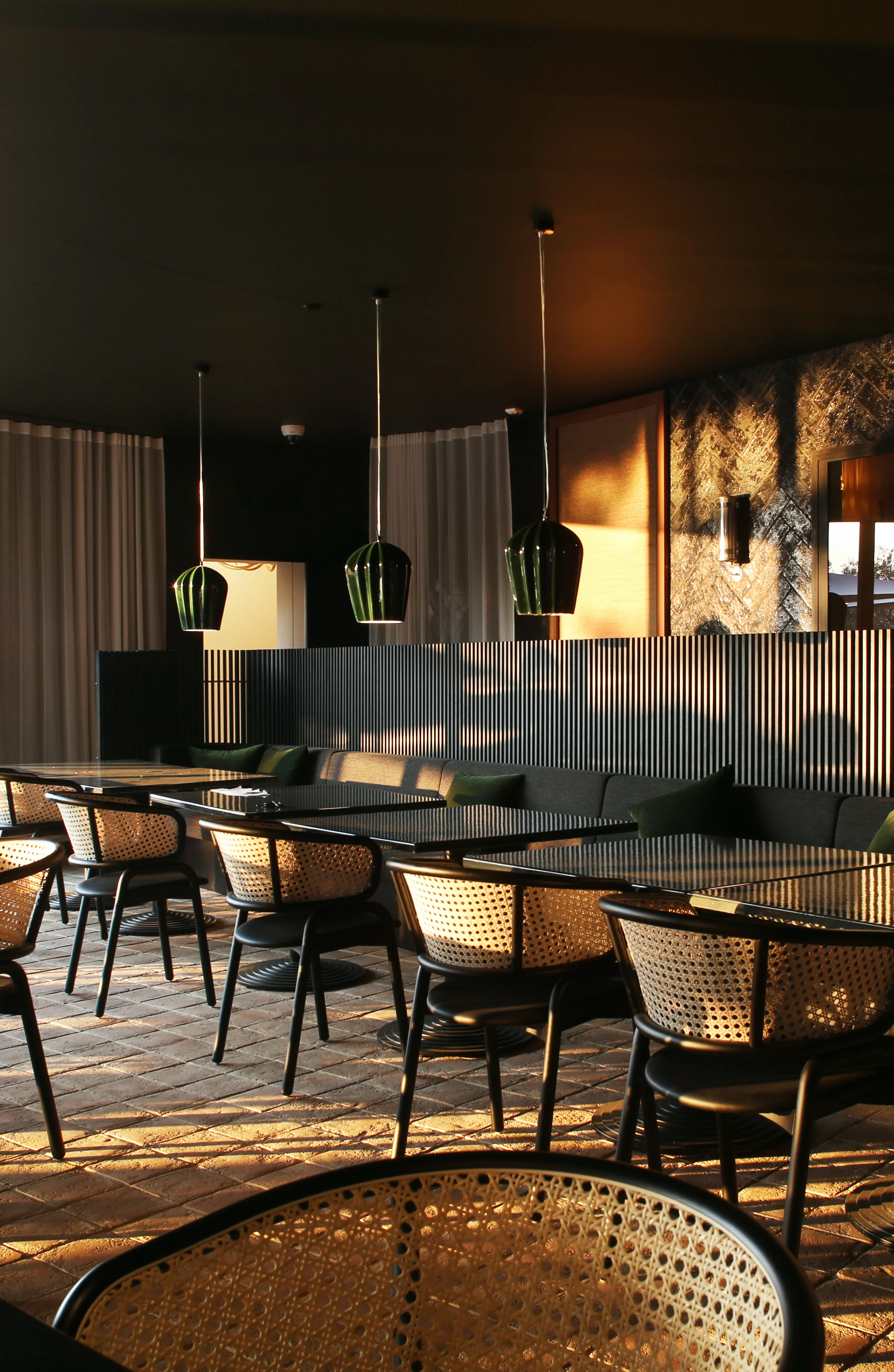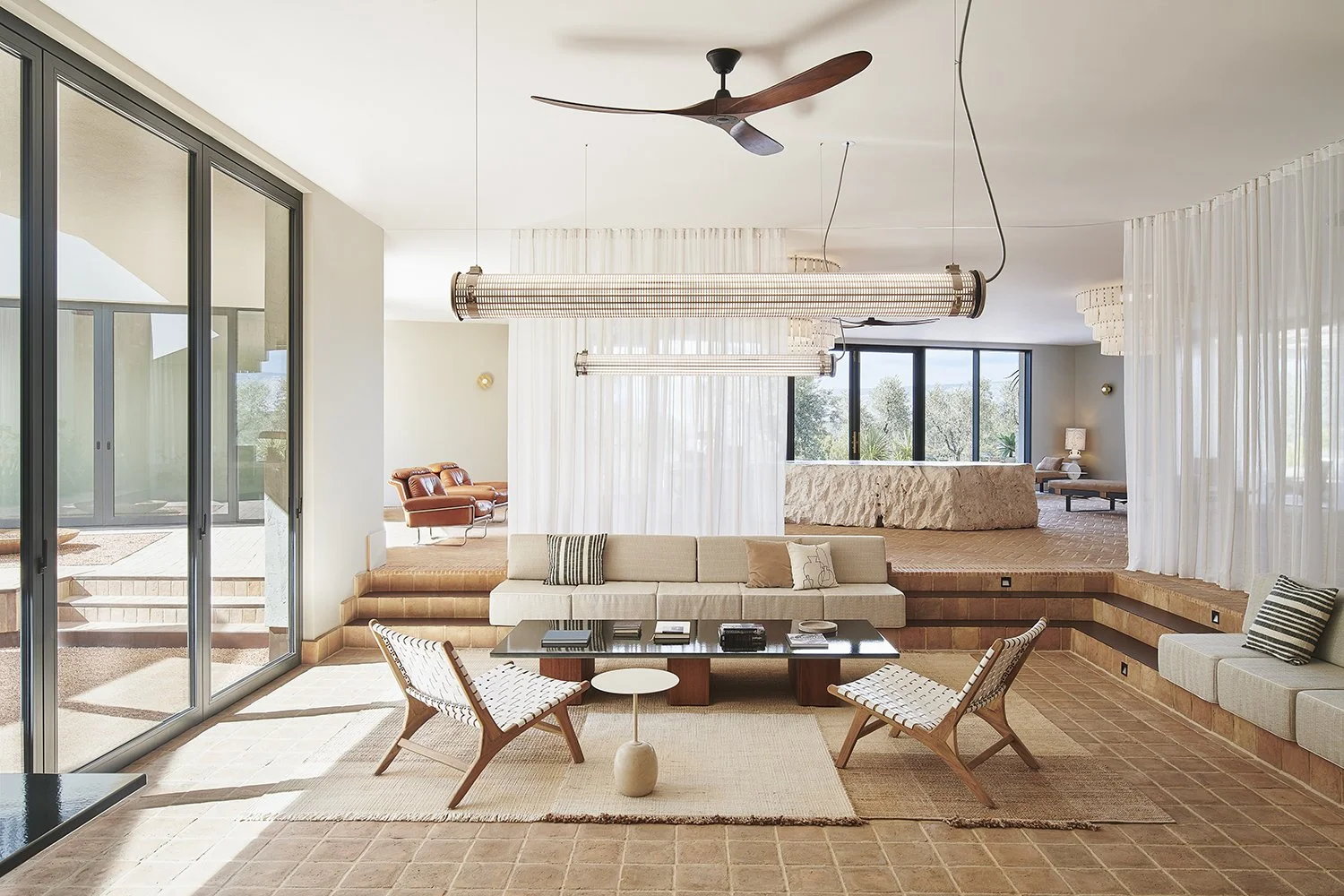 Custom-made cracked raw stone desk lobby filled with bronze and enamelled lava stone tables, Italian alabaster chandeliers and fabrics. Bamboo canopy by Déambulons, terracotta lighting by Hand & Eye Studio, daybeds by Charlotte Juillard.