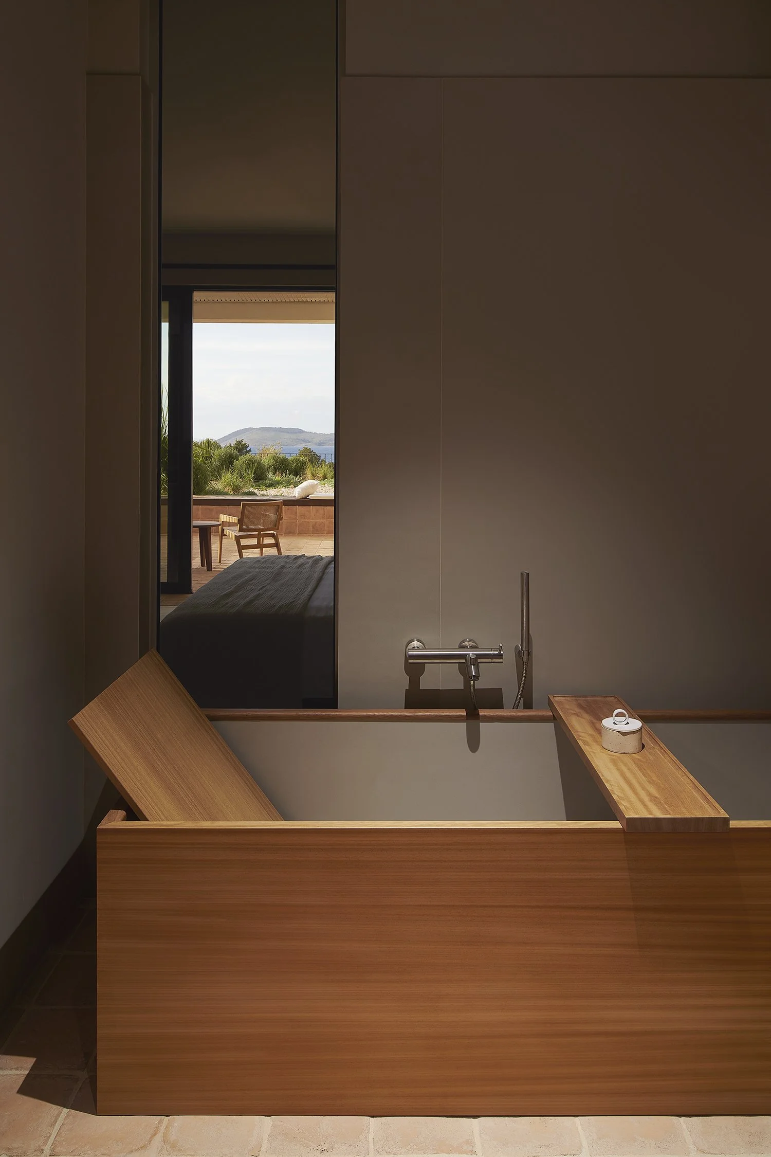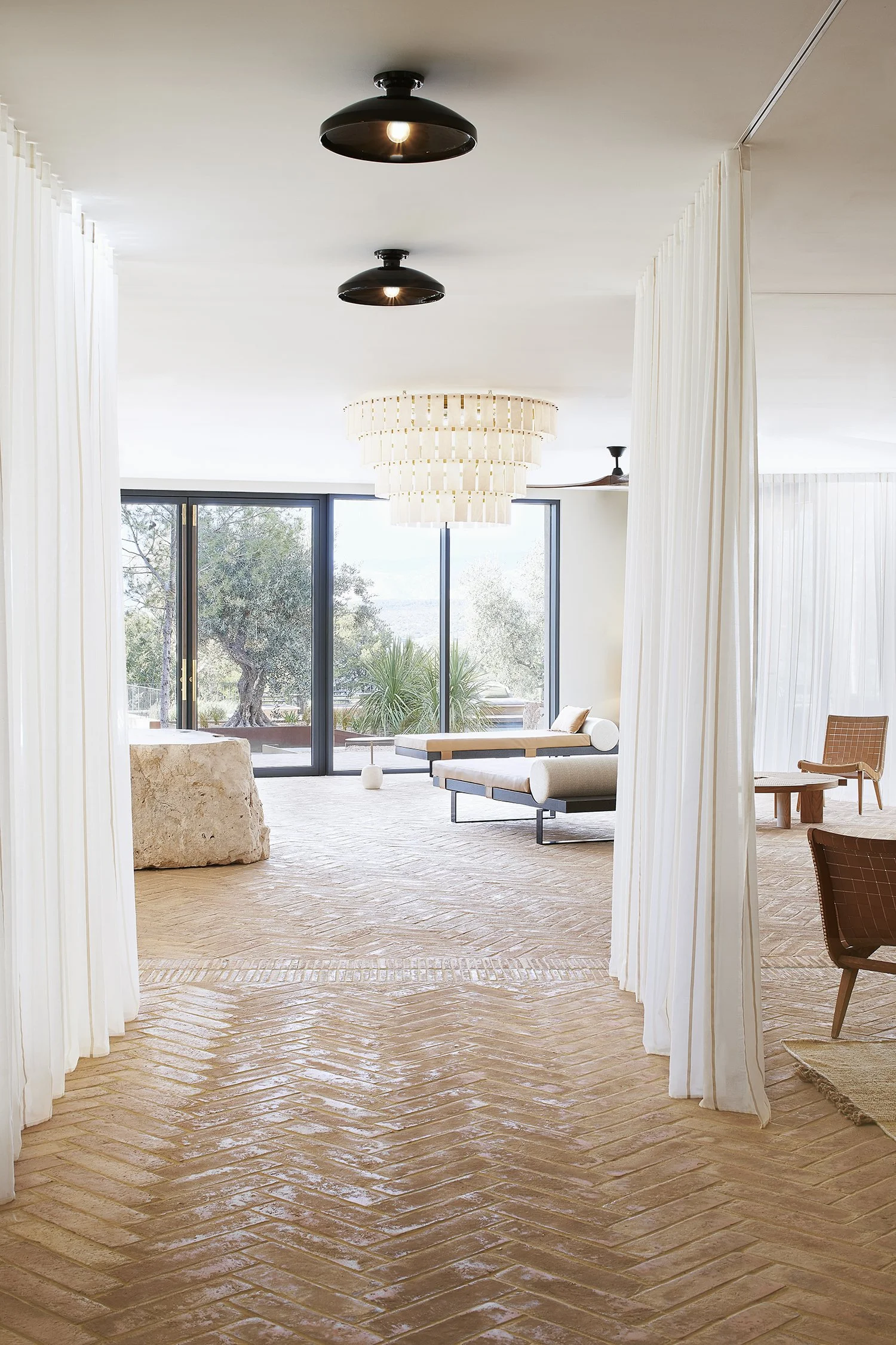 Hall d'accueil en pierre brute fissurée, fait sur mesure, rempli de tables en pierre de lave émaillée et en bronze, de lustres en albâtre italien et d'étoffes. Baldaquin en bambou de Déambulons, éclairage en terre cuite de Hand & Eye Studio, lits de jour de Charlotte Juillard.
